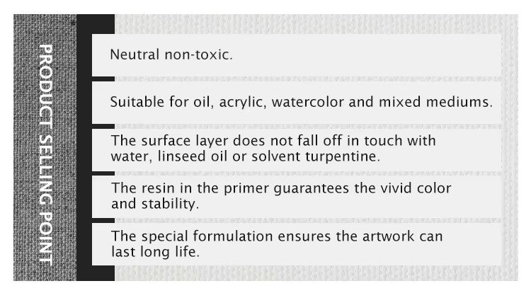● المتانة منذ فترة طويلة:هذا القماش الفني الذي تم إنشاؤه للرسم. يقاوم إطار الصنوبر المجفف بالفرن تزييفًا في بيئات الرطوبة بنسبة 30 ٪ -70 ٪. تقبل الأسطح المزدوجة ذات الطلاء الزيتي ، وطلاء الأكريليك ، والوسائط المختلطة دون نزيف.